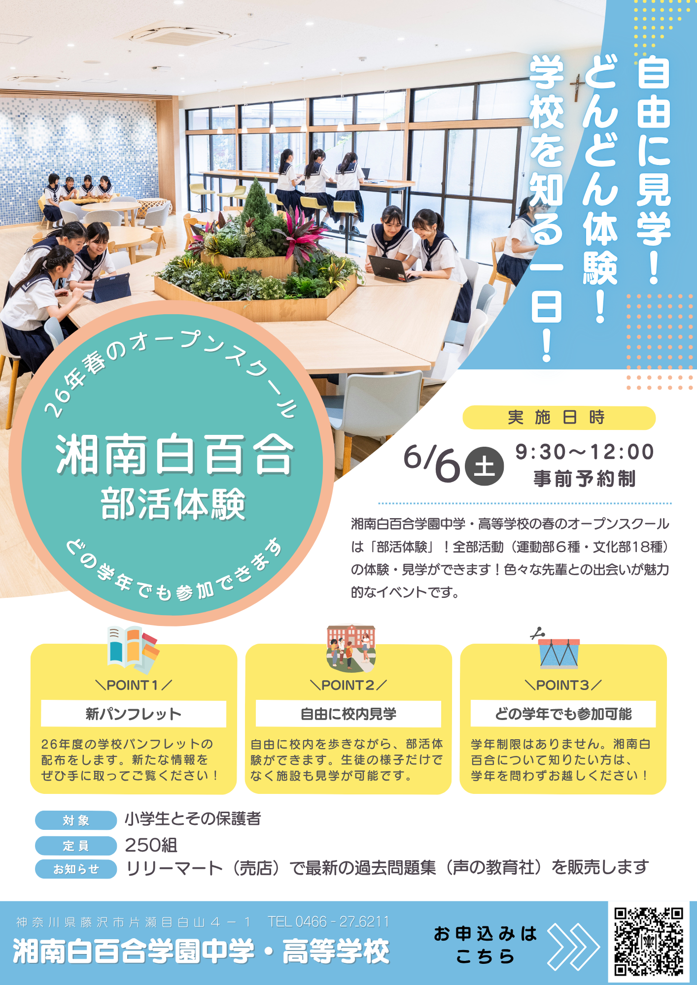 神奈川県内にある全私立学校がブースを出し、魅力をアピールする「神奈川私立中学展」へ本校も参加します。会場はパシフィコ横浜の展示ホールC・Dです。 本校のブースでは、学校生活や入試についての相談が可能で、教員のほか生徒も参加します。 参加全57校のスピーチリレーの実施や私学の魅力講演会、私学なんでも相談コーナー、そして制服展示コーナーもありますので、ぜひご参加ください。