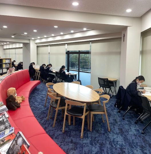 また、静かに集中できるメディアネットラボ(図書室)は、深く自習に取り組む生徒たちにとって定番の場所です。広い閲覧スペースで資料を広げ、問題集に向き合う真剣な姿が印象的です。