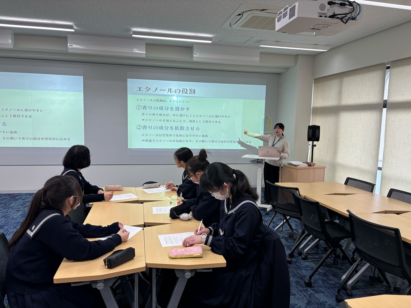 受講した生徒たちは、普段何気なく感じている香りの背後に潜む「化学の不思議」に驚き、熱心に耳を傾けていました。身近な生活体験と学問が繋がる楽しさを、大学生との交流を通じて肌で感じる貴重な探究のひとときとなりました。