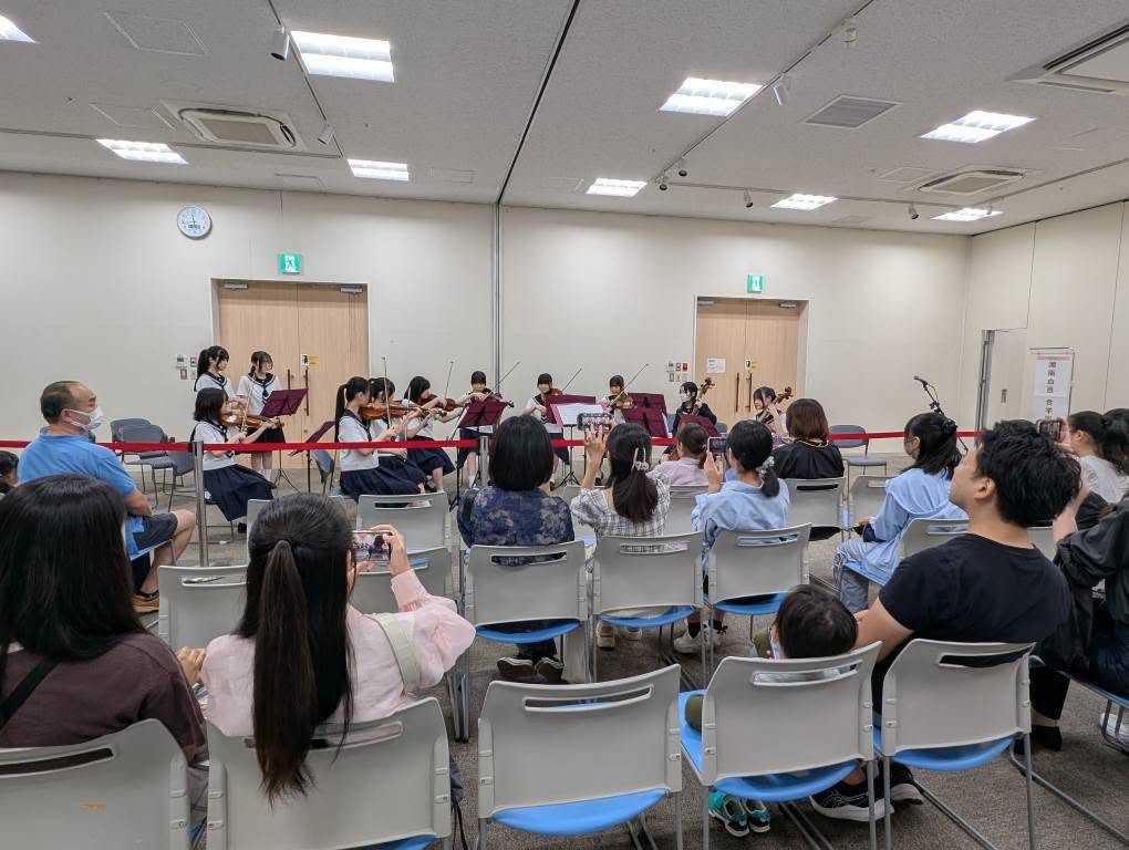本校のブースでは「キラキラ万華鏡を作ろう」ワークショップを実施し、多くのお客様に楽しくご参加いただきました。また、パフォーマンスステージでは、管弦楽部の中学3年生による弦楽器のミニ演奏会を行いました。クラブの伝統曲「そりすべり」や、「ディズニーメドレー」など、お馴染みの親しみやすい曲をお届けし、皆様にお楽しみいただけました。