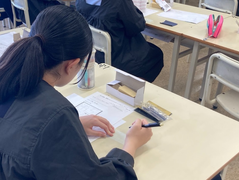 篆刻とは、自分の名前などを題材に印面をデザインし、石を彫って印を作る伝統的な芸術です。授業ではまず、自分の名前をもとにしたデザインを考えるところから始まりました。字体を工夫したり、名前に関連したイラストを組み合わせたりと、ひとりひとりが個性を生かして創意工夫を凝らしていました。