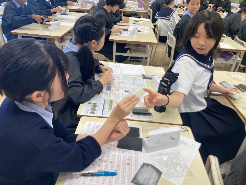 デザインが完成すると、印面をやすりで丁寧に磨く工程へ。ざらざらだった表面がつるつるに変わっていく感触に驚き,友人同士で「すごい!」と感想を共有する姿も見られました。その後、転写したデザインに沿って彫刻刀を使い、慎重に線を彫り進めていきます。細かな部分まで思い通りに表現しようと、どの生徒も集中して作業に取り組む様子は印象的で,なかにはデザインにこだわったために細かな線に苦戦する様子も。