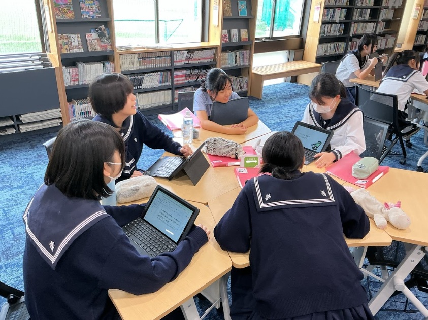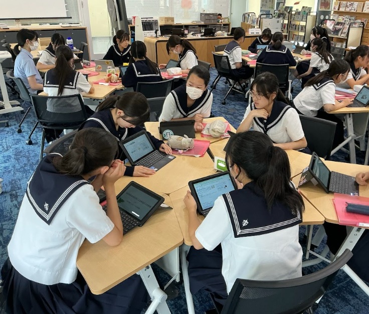 スライドが形になってきた生徒たちは、同じ班のメンバーに発表をお披露目し、第三者の視点を取り入れて改良を加えています。例えば、「友達は、私が思っていたより大きな文字を使って表現しているな」、「写真やグラフにアニメーションをつけて、強調しているのが効果的だな」など、互いの工夫から良い刺激を受けながら、より完成度の高い発表を目指してスライドを磨き上げています。生徒たちはこの活動を通して、自分の考えを表現する楽しさと伝える力を大きく伸ばしています。