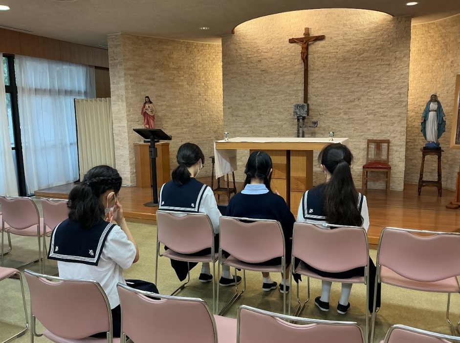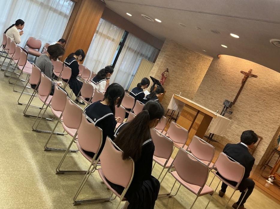 本校では、朝礼前にカトリック研究部の生徒たちを中心として、ロザリオの祈りを行い、心を落ち着けて祈る時間を持っています。