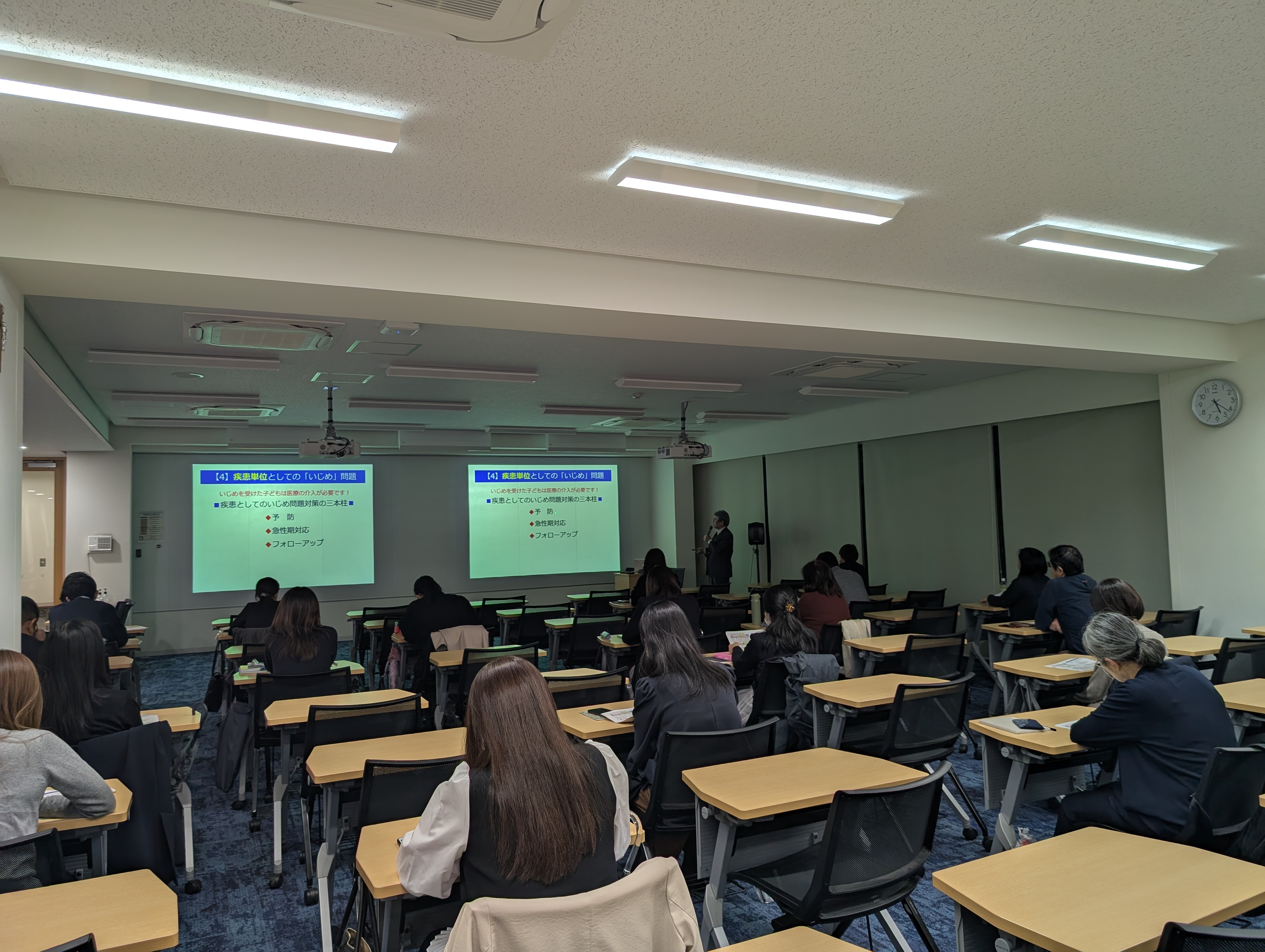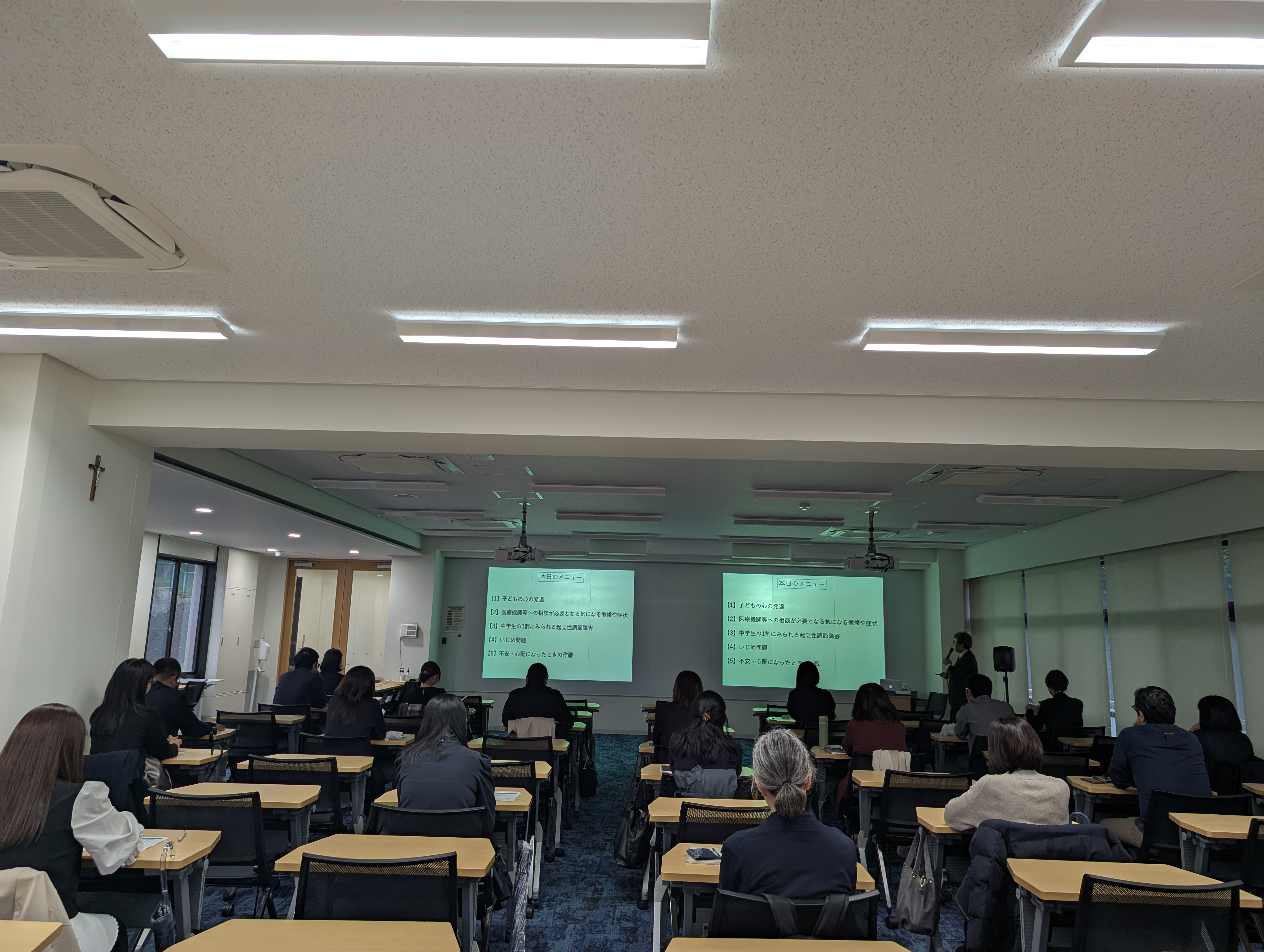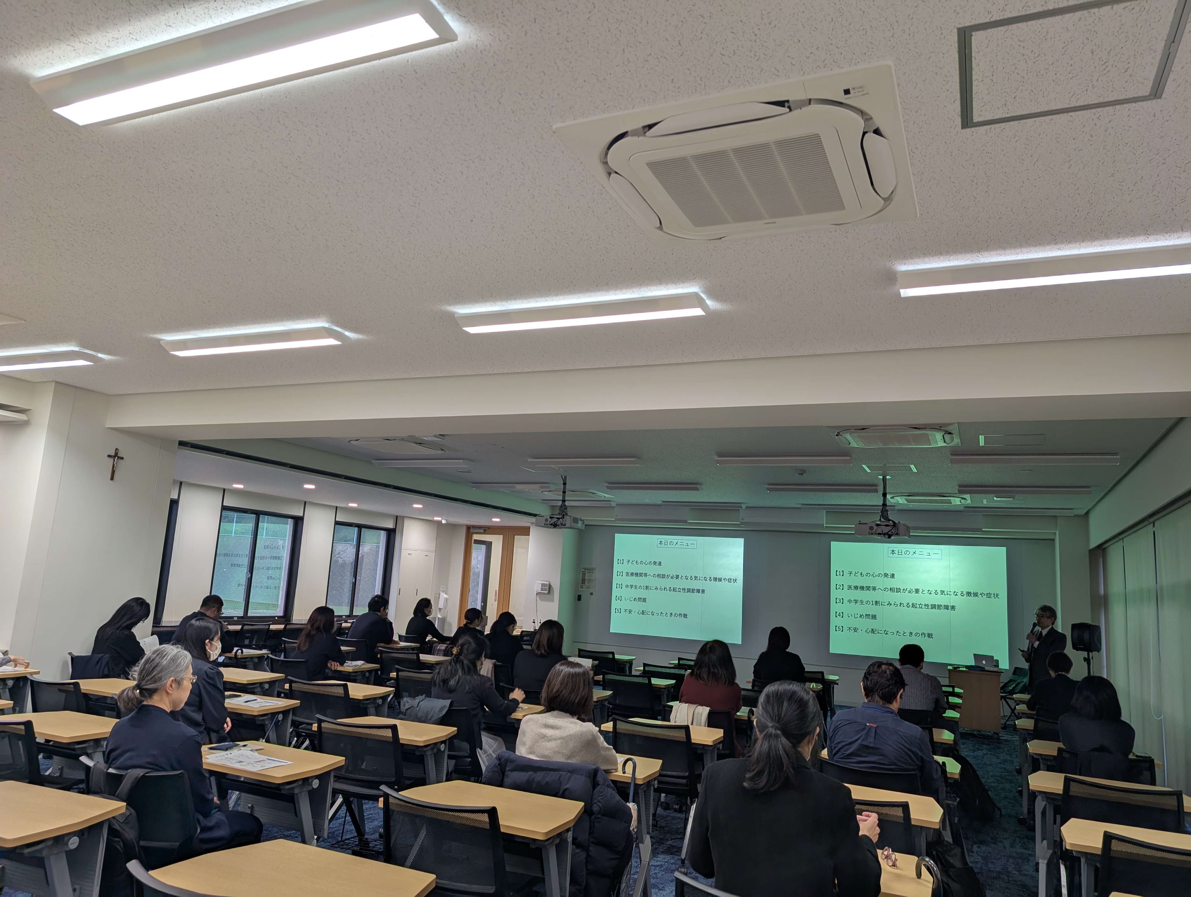 昭和医科大学の副学長であり、保健管理センター所長を務める田中大介教授を講師にお招きし、「思春期のメンタルケアについて— 子どものこころの成長発達と家庭・学校における留意点 —」と題した講演をいただきました。保護者と教員が参加する中、教授は思春期の子どもの精神面での発達や、それに伴って起こりうる疾患なども含め、具体的で多様な事例を紹介してくださいました。