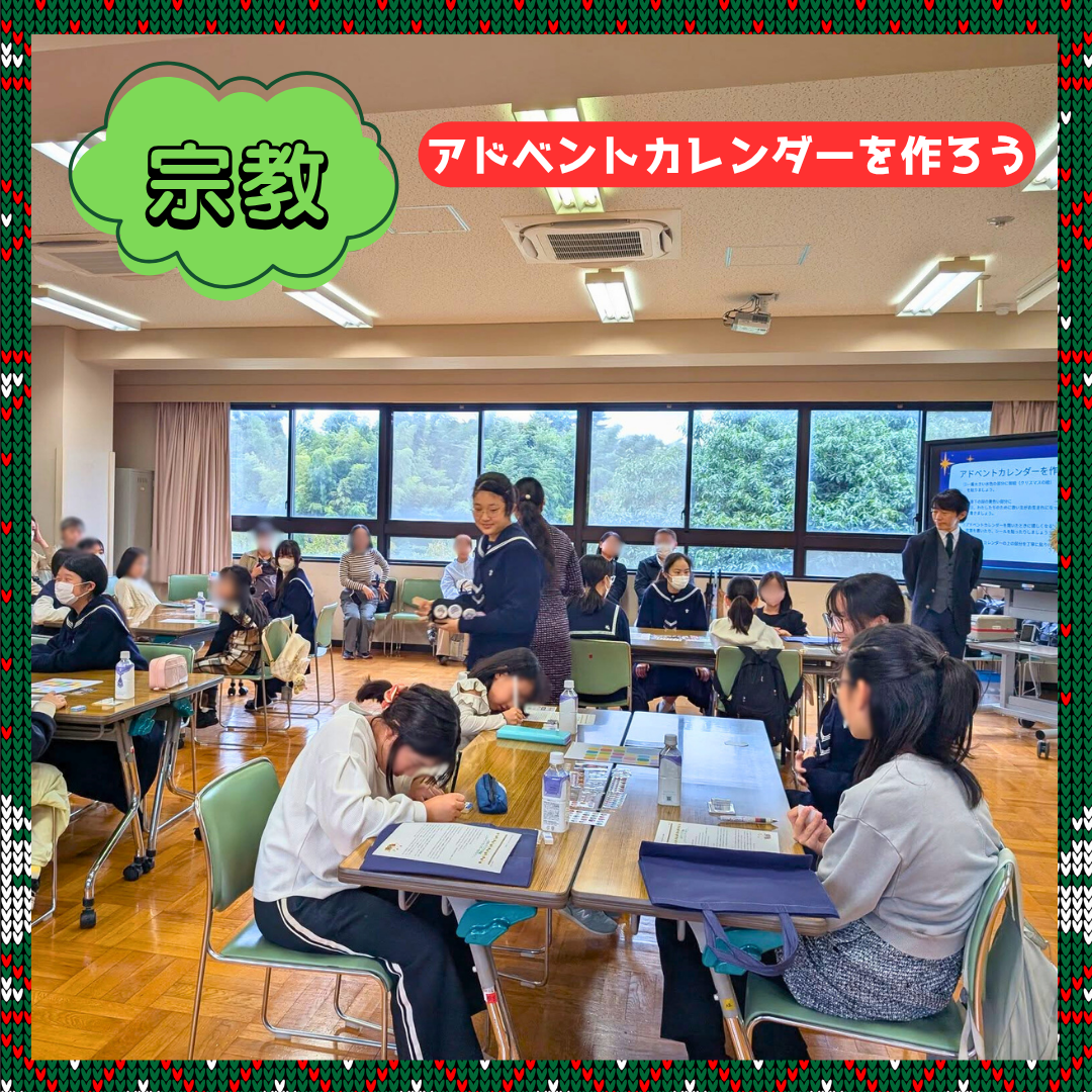 特に大人気だったのは「書道」の「グラスに文字を彫ろう」です。書道の先生から美しく文字を書くコツを教わった後、オリジナル缶バッジやグラスに好きな漢字を彫り込み、思い思いの素敵な作品を完成させました。「宗教」の授業では、アドベントのお話を聞いた上で、生徒と一緒に「アドベントカレンダーを作ろう」に取り組み、キリスト教文化に触れました。「算数」では、好きな色のビーズを選んで「正多面体ストラップを作ろう」に挑戦。本校生徒が優しくサポートする中で、オリジナルのストラップづくりを楽しみました。