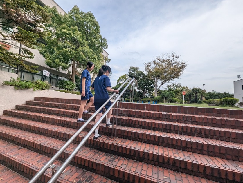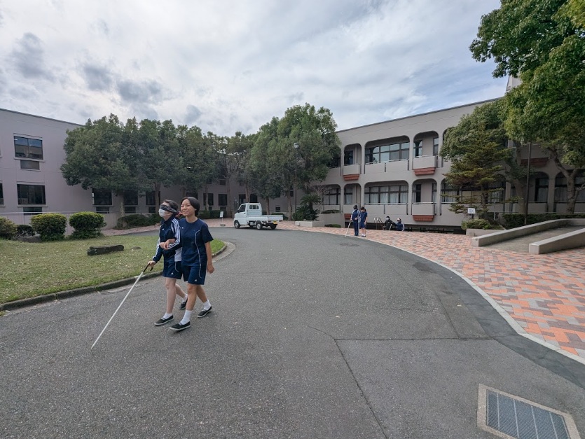 車いす介助体験では、ペアになって平坦な道や坂道、段差がある道などを実際に押したり、白杖体験では、白杖と友だちのサポートを受けながら階段やでこぼこした道を歩いて学校を一周したり、実際に体験することで、どのようなところに配慮すべきか学びを深めることができました。