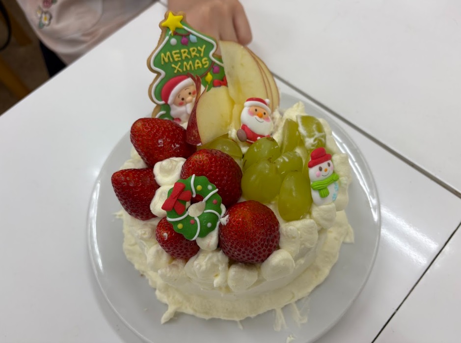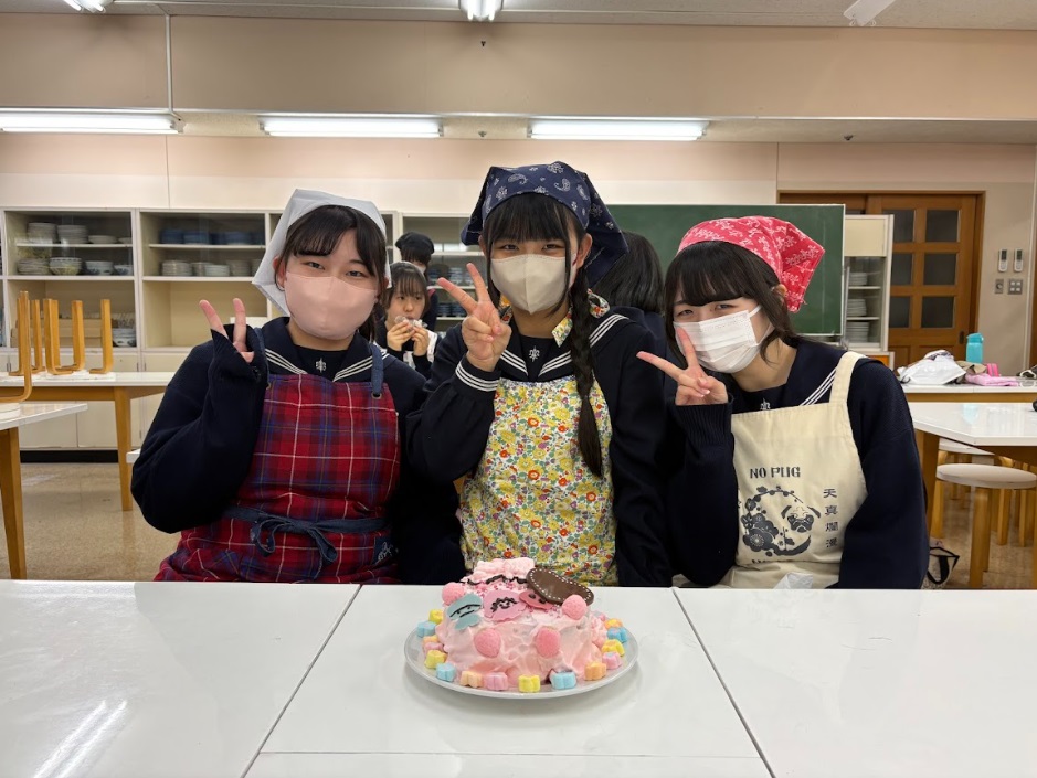 クリスマスに向けたケーキ作りでは、班ごとに具材やデコレーションを相談し、テーマを決めてオリジナルの仕上がりを目指しました。色とりどりのフルーツを重ねて華やかに仕上げる班や、チョコレートやクリームの組み合わせを工夫して個性を表現する班など、どれも班のアイデアが光る作品となりました。実習ごとに自然と役割分担ができ、作業の流れを自分たちで整えていく姿には、この一年間の成長がしっかり感じられます。
