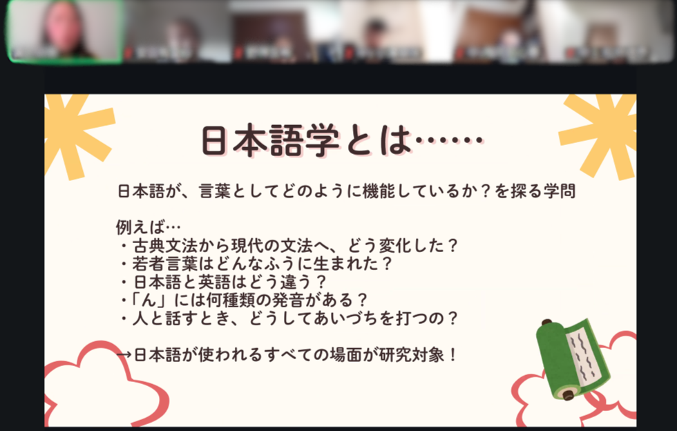 講師を務めてくださったのは、お茶の水女子大学文教育学部の学生です。講座では、音の響きがどのような法則で気持ちや物事の様子を伝えているのか、日本語学の視点から紐解いていきました。