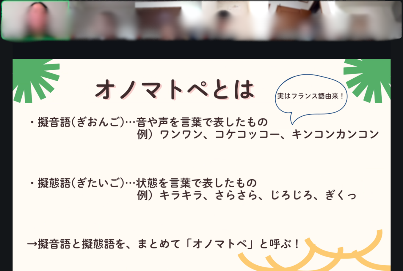 「ワクワク」「さらさら」――。私たちが日々何気なく使っている「オノマトペ(擬音語・擬態語)」を手がかりに、日本語の奥深さを学ぶオンライン講座が開催されました。