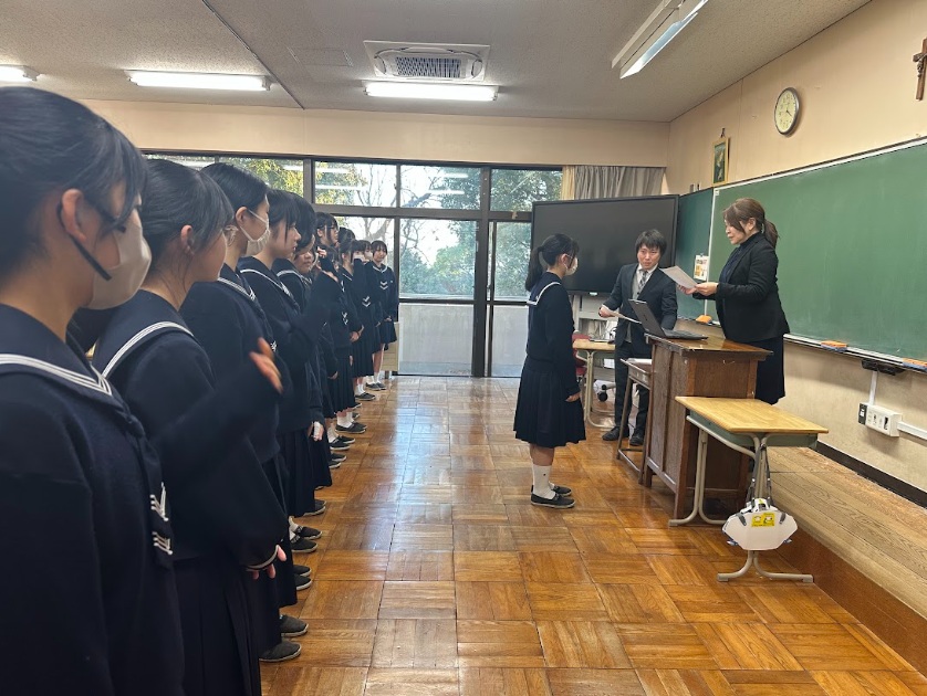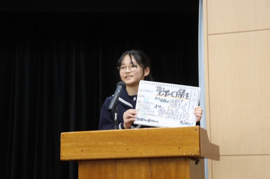先月、中学3年生のホームルームの時間において、次年度の聖ポーロ祭実行委員を選出する選挙が行われました。 「どのような聖ポーロ祭にしたいか」、「実行委員として何に挑戦したいか」と立候補した生徒一人ひとりが中学3年生の前で力強く、聖ポーロ祭に対する熱い思いを胸に演説を行いました。その熱意溢れる言葉からは、聖ポーロ祭に向けたそれぞれの思いが伝わってきました。演説ののち、中学3年生の生徒たちによる投票を行った結果、16名の実行委員が決定いたしました。