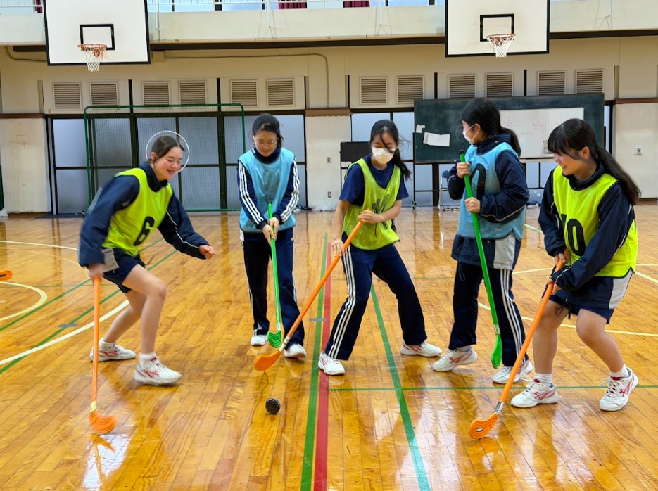 英語の授業では、オリンピックが「平和の祭典」であるという理念に触れながら、冬季競技を題材に学習。スポーツを通じて国や文化を越えてつながる大切さを学びました。その成果を活かし、体育の授業ではフィールドホッケーとフロアカーリングを実践。競技中には、事前に確認した「Nice shot!」「Don’t worry!」といった英語の応援フレーズが自然と飛び交いました。