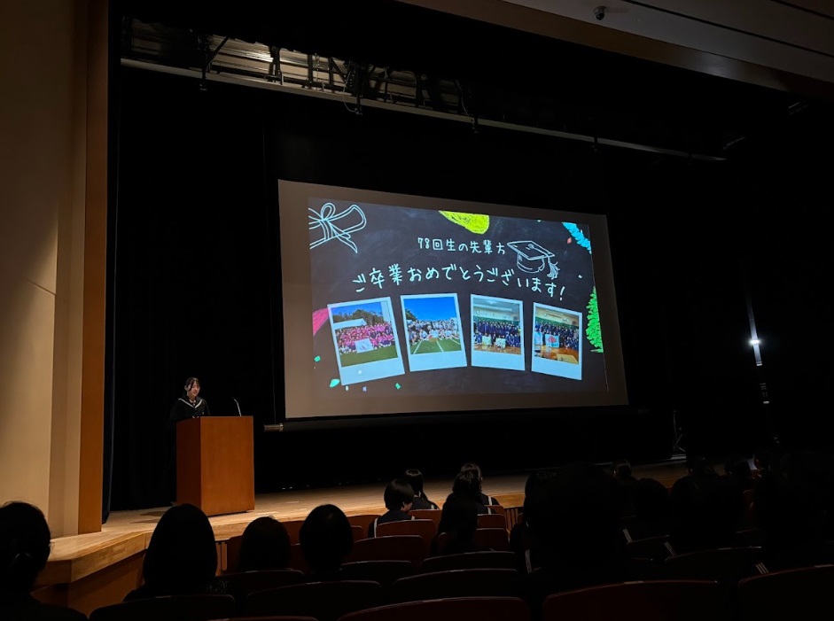 午前中の送別会では、各部活動が心を込めて制作した動画や、先生方からのメッセージ動画を鑑賞しました。思い出の写真やこれまでの様子が映し出されるたびに、会場からは笑い声や温かな拍手が起こり、6年間の歩みを振り返るかけがえのない時間となりました。先生方からの励ましと感謝の言葉に、目を潤ませる生徒の姿も見られました。