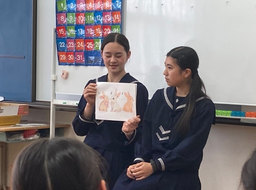 まず、担当教員による「聖パトリックの日」にちなんだアイスブレイクを実施。その後、生徒たちは「イースター」をテーマにした独自のプログラムを披露しました。単語ペア作りゲームや宝探し、英語での読み聞かせなどを通して、小学生が自然に英語へ触れられるよう工夫を凝らしました。