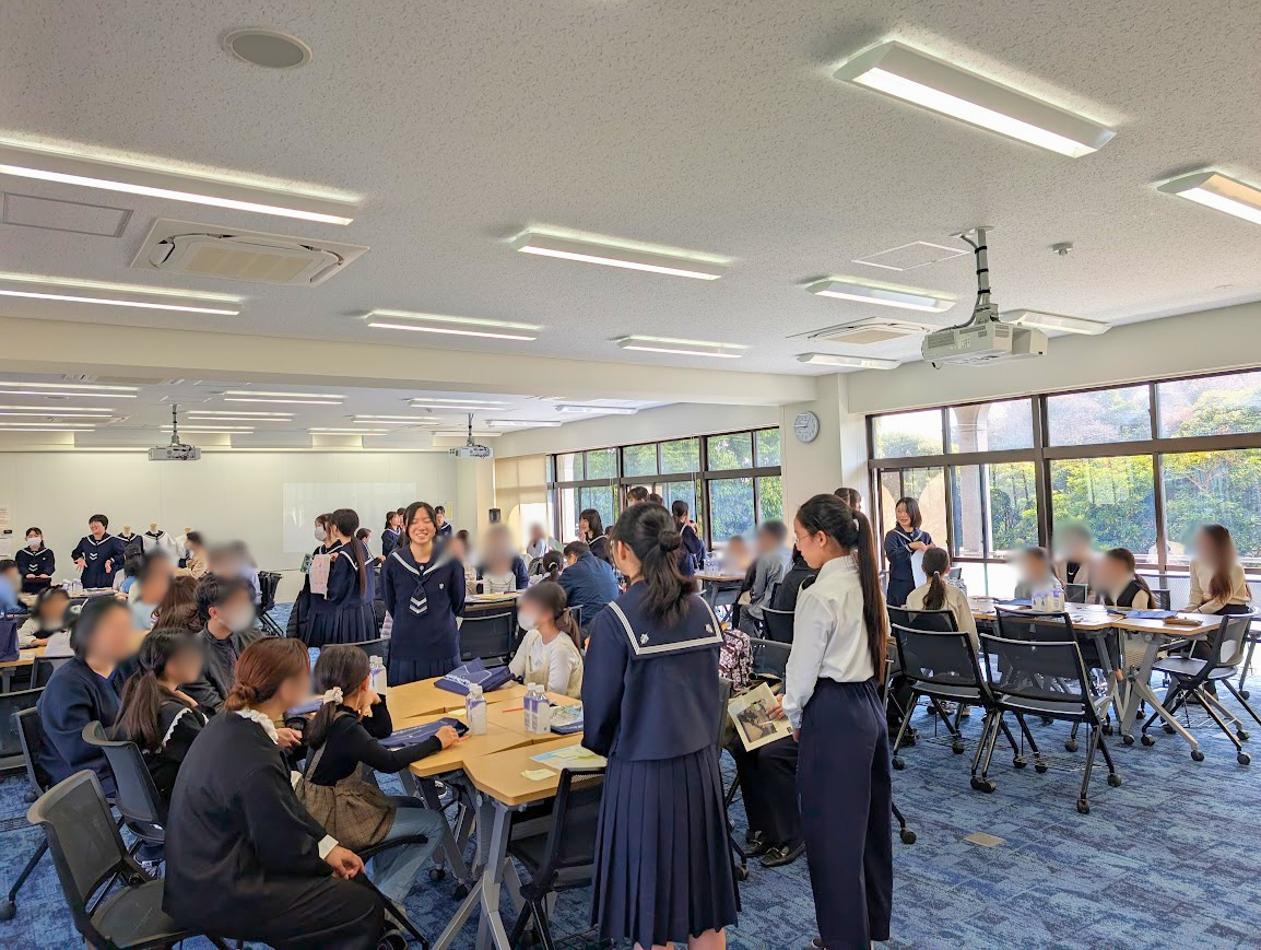 中庭の桜が咲き始め、遠く相模湾まで一望できる春爛漫の景色の中、施設の見学だけでなく、生徒たちの笑顔と温かなおもてなしを通じて、本校のありのままの雰囲気を感じていただける貴重な機会となりました。