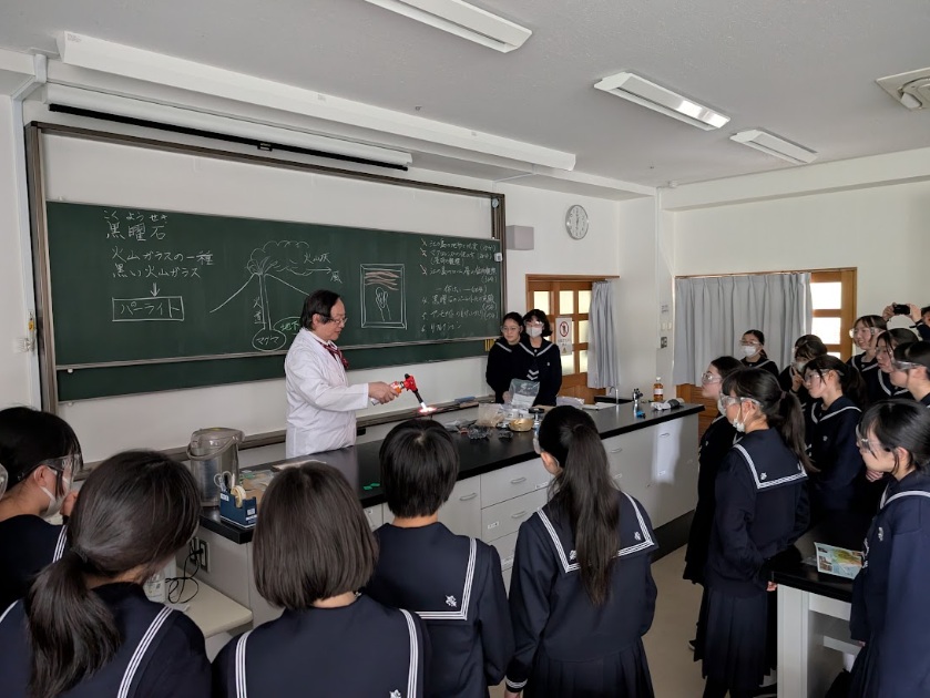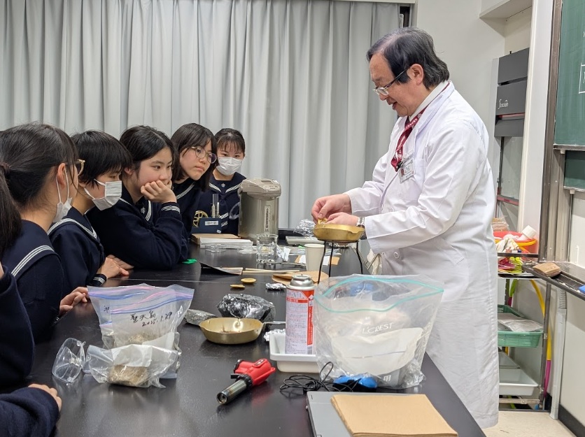 さらに、火山灰に含まれる発泡火山ガラスの成因を解き明かすため、黒曜石のパーライト化実験を見学。目の前で起こるダイナミックな変化に、生徒たちは釘付けになっていました。最後には、お土産として自宅で標本作りができるアンモナイトの模型をいただきました。専門的な機材や実験の数々に終始目を輝かせながら、身近な場所から広がる地学の世界を存分に楽しんでいました。
